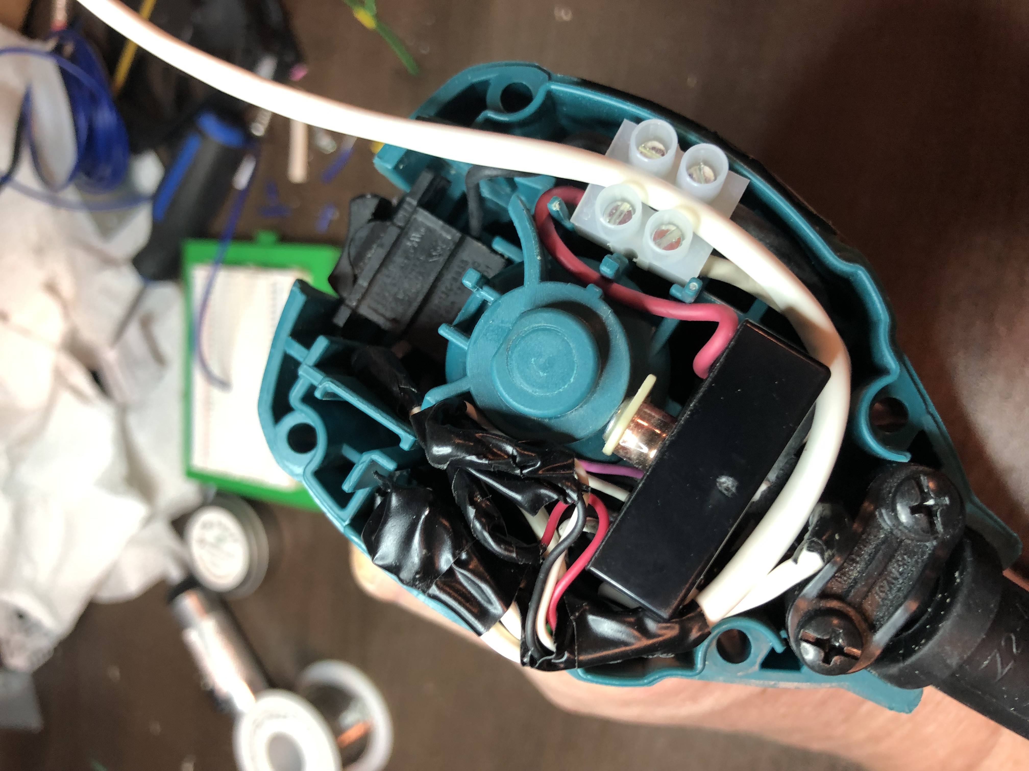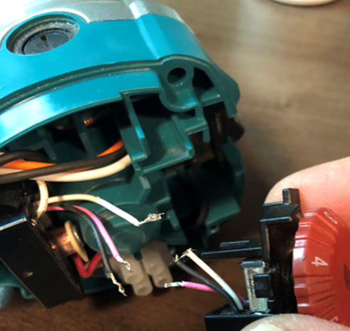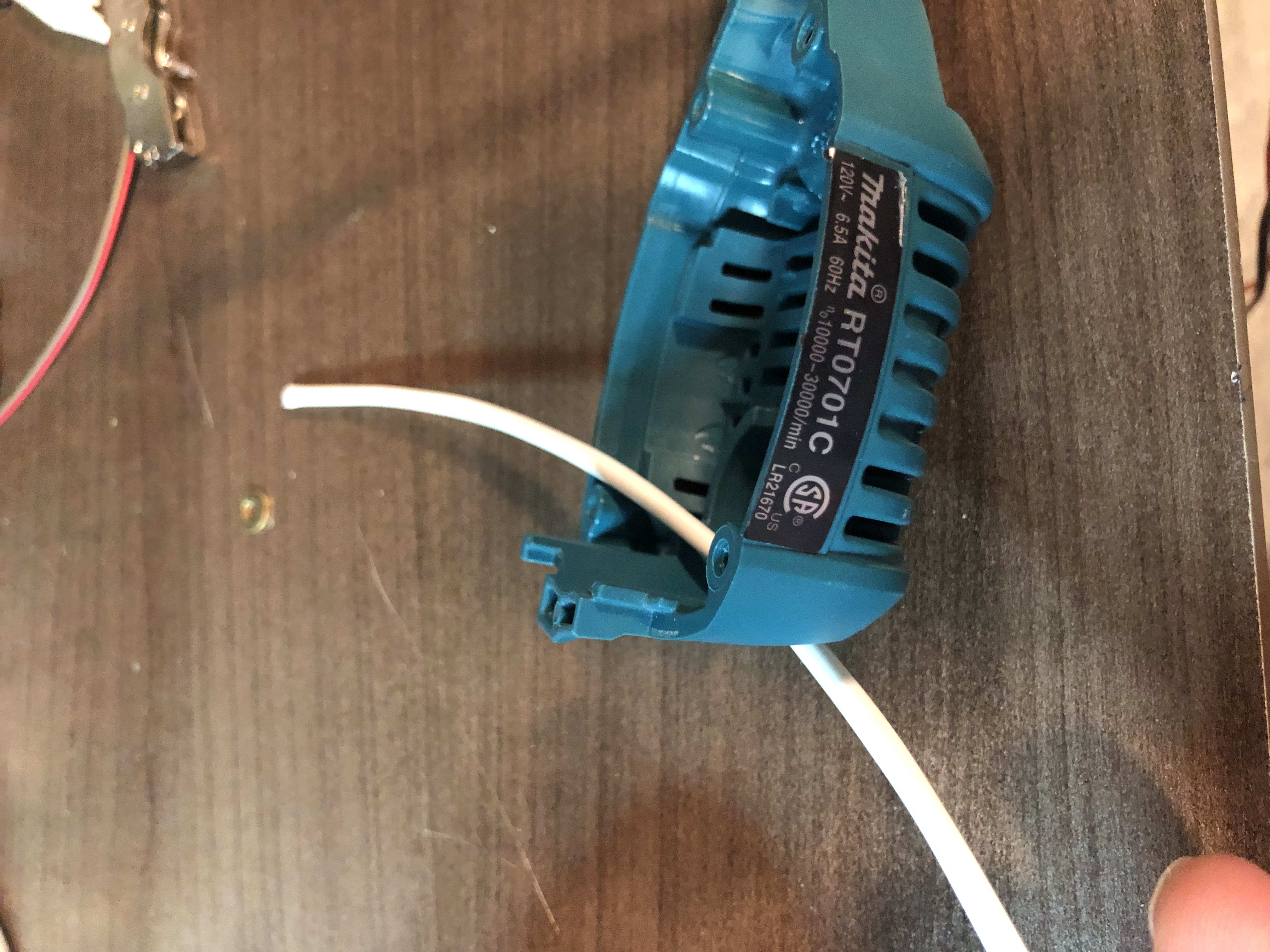 Start by removing the router and remove the four screws holding the cap. Once open, run the wiring through the cover before making any connections. Now locate the red/white/black wires from the speed dial. Cut these wires and remove the Makita dial making sure there is enough wire left to make the connections. Connect the Makita red/white/black to GRBL_SPD red/white/black (refer to connection diagram). Locate the white wire from the Makita switch if you are connecting the internal optional relay. Cut the white wire leaving enough length to make connections to both ends. Connect high voltage wires from relay to both ends of the cut white wire (refer to connection diagram). Connect low voltage wires to remaining connections on the relay(refer to connection diagram). The relay can be placed in the cavity on the opposite side of the main power connector or where the speed dial used to be. Screw the top of the router back on making sure not to pinch any wires and mount router back onto CNC.