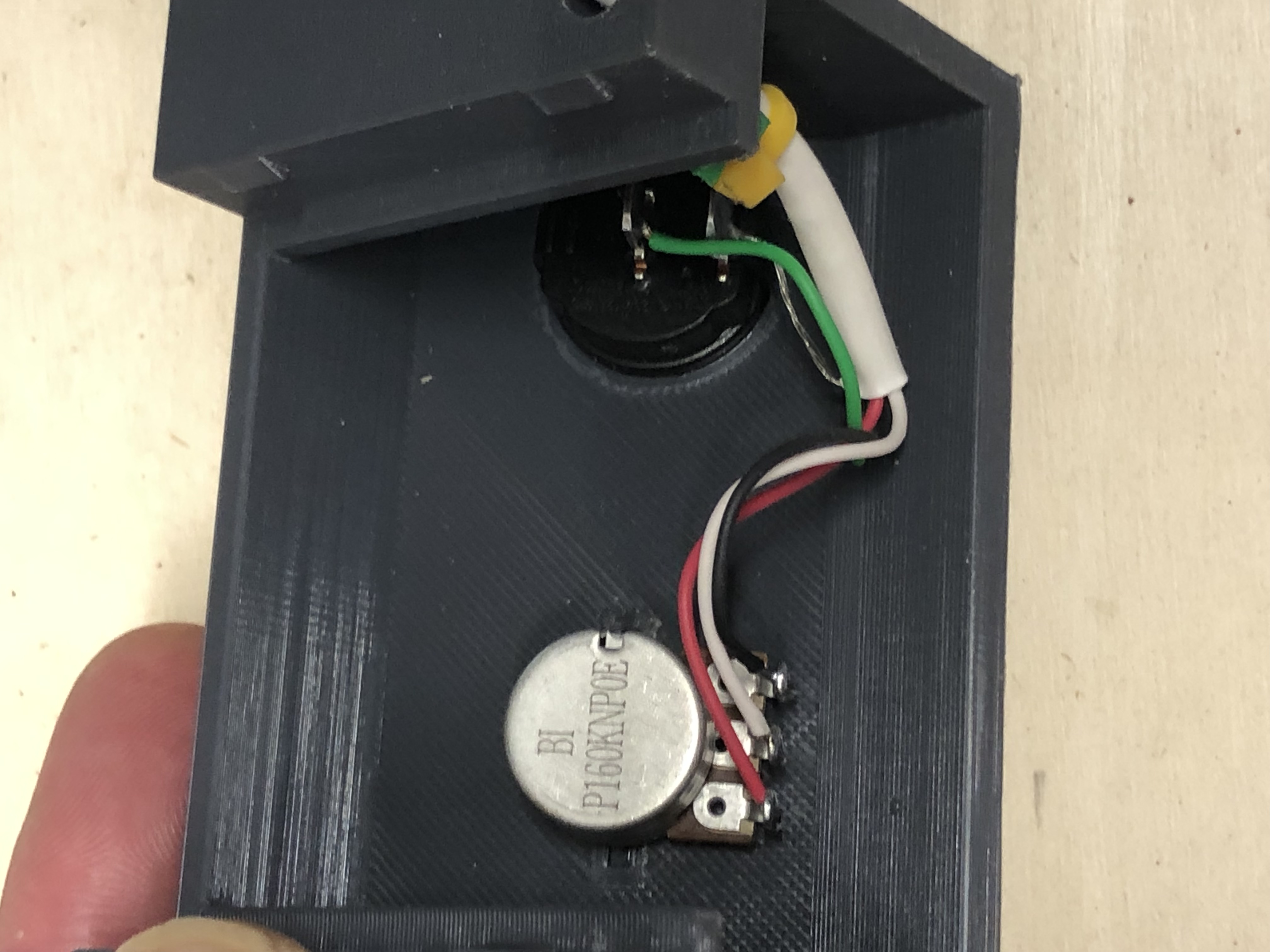 If you have downloaded and printed the stl file provided here then start by running the wires through the printed hole at the back. If your wires are going to go downward from the enclosure then start by connecting the wiring to the potentiometer (refer to connection diagram). Mount the potentiometer and the switch into the 3D printed enclosure. Connect the remaining two wires to the switch.