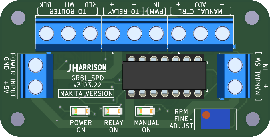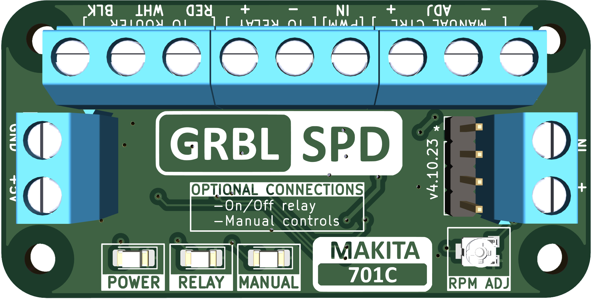 This project allows for automatic control of a standard Makita 701C router for CNC machines. GRBL_SPD lets you set the rpm for your bits in software such as Vectric and have it automatically set your router. This cicuit replaces the potentiometer in the router and has an accuracy of approximately between +/- 100 to 200 RPM. In most cases this deviation has no impact on the machining process. You no longer have to turn on the router before sending the file, GRBL_SPD will do it for you. There are inputs for manual control which overrides the RPM setting in the GRBL file being sent.