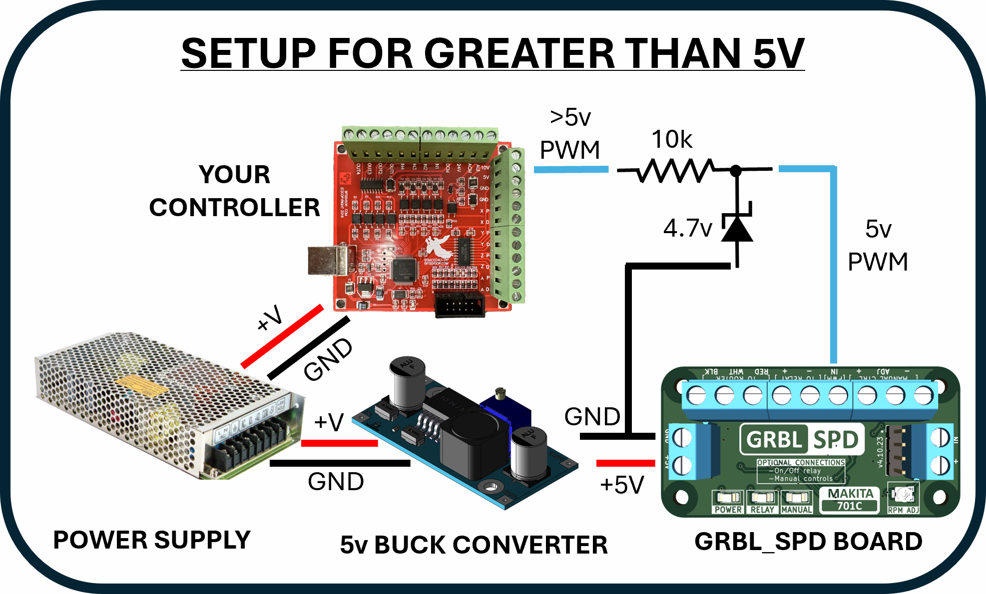 Run the wire from the router to the control box through the drag chains if equipped. Run the wires from the manual controls if installed. Make the router and manual control connections to the GRBL_SPD board (refer to connection diagram). Connect the PWM wire to the GRBL controller. Connect the 5v power and ground to the GRBL controller. Take a moment to check all connections.